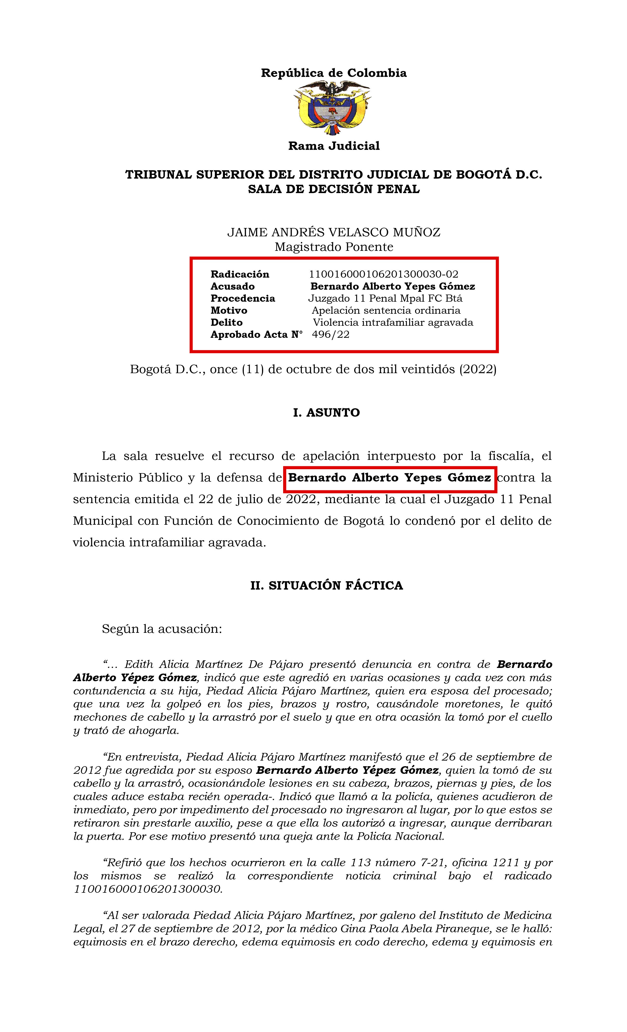 La sentencia indica que, el abogado Bernardo Alberto Yepes Gómez maltrató físicamente, y denigró a su entonces pareja sentimental durante varios años.