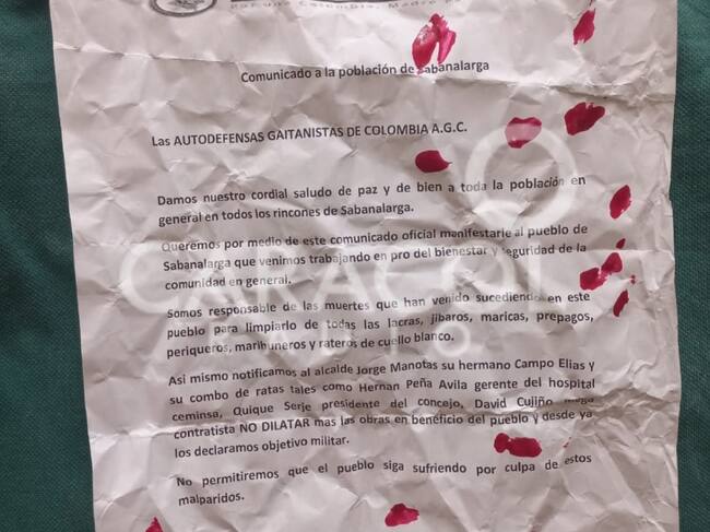 Tras conocerse un panfleto firmado por, al parecer, el ‘Clan del Golfo’ y en el que son amenazados funcionarios públicos de Sabanalarga, Atlántico, entre ellos el alcalde municipal, Jorge Manotas, la Policía anuncio que hará un acompañamiento al mandatario.