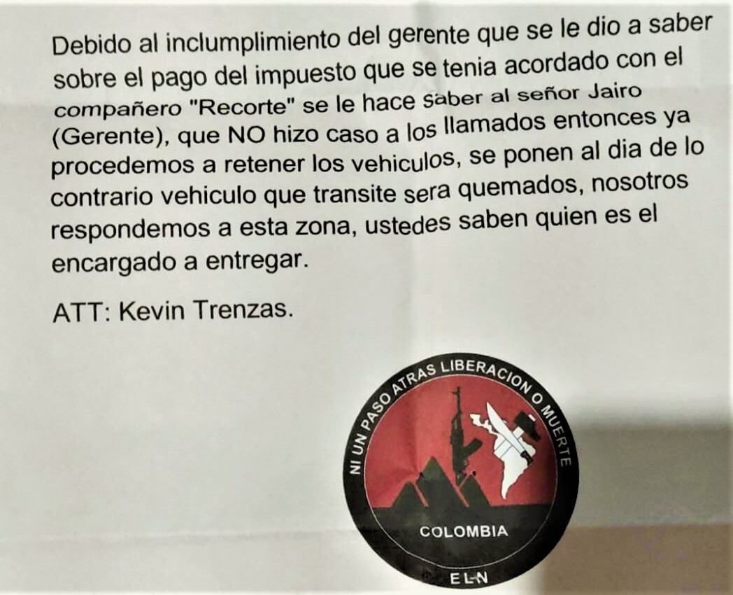 La empresa Transtambo suspendió sus operaciones luego de recibir un panfleto firmado por el ELN en el que anuncian que incinerarán los vehículos por no acceder a sus pretensiones.
