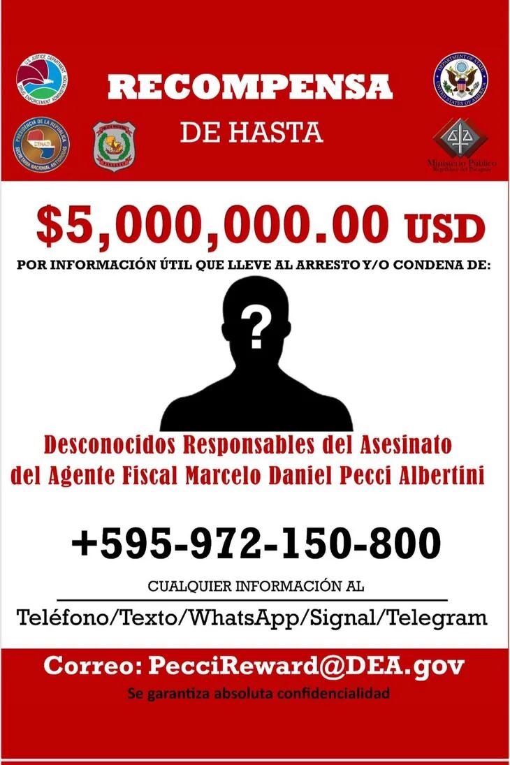Seis meses después del asesinato del fiscal anticorrupción Marcelo Pecci en Cartagena (Colombia), el embajador de Estados Unidos en Paraguay, Marc Ostfield, anunció que el gobierno Biden ofrece hasta 5 millones de dólares como recompensa por datos sobre los responsables del crimen.