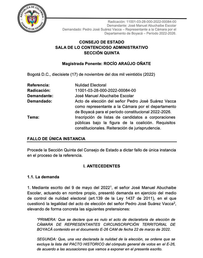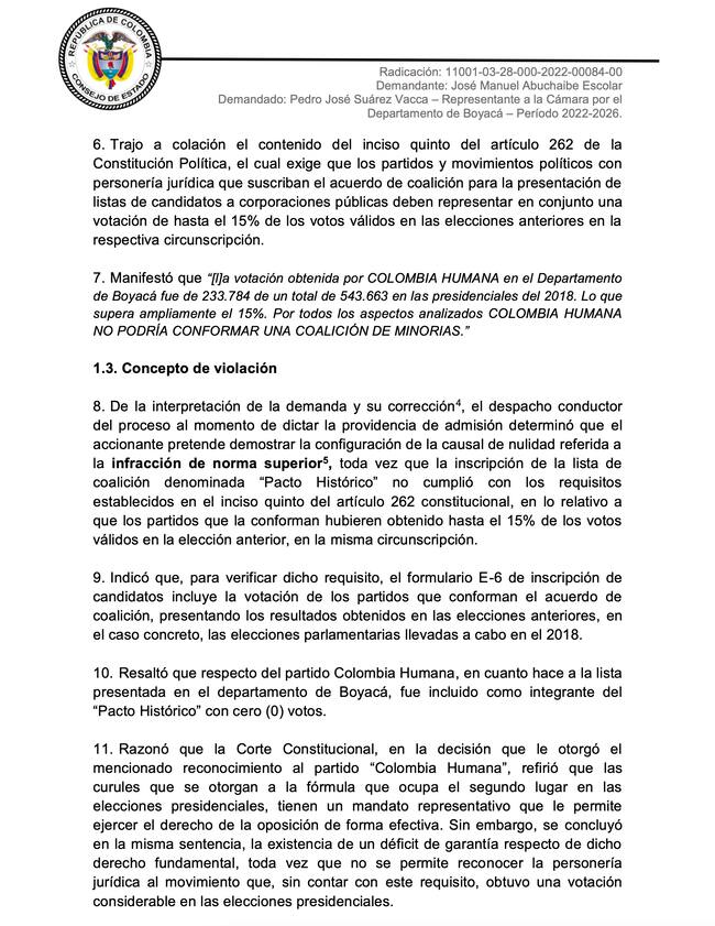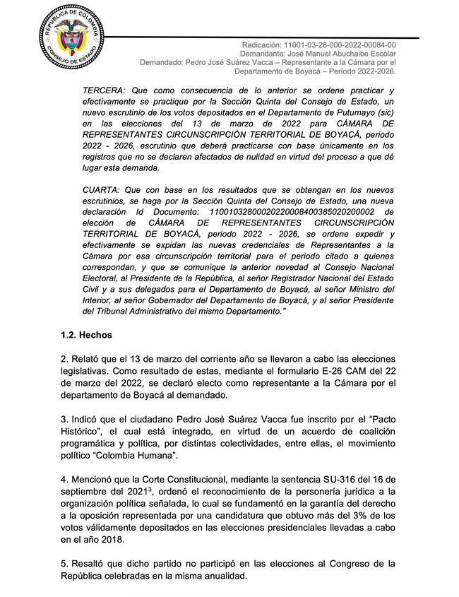 Sin embargo, luego de analizar la demanda, la Sección Quinta del Consejo de Estado, concluyó que, por un lado, no se configuró ninguna irregularidad en los votos obtenidos porque Pacto Histórico no participó en las elecciones al Congreso de la República de 2018 y tampoco hay pruebas de que se haya configurado falsedad en los formularios E26.