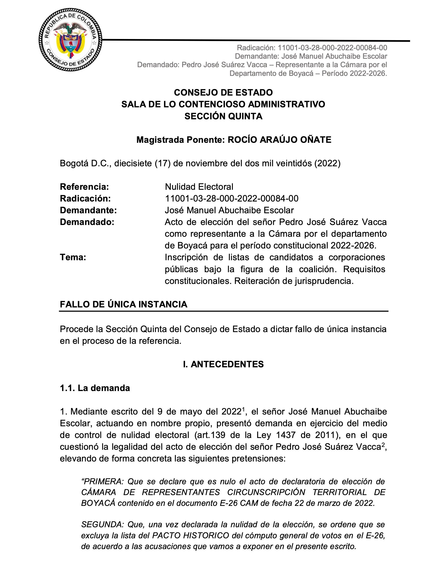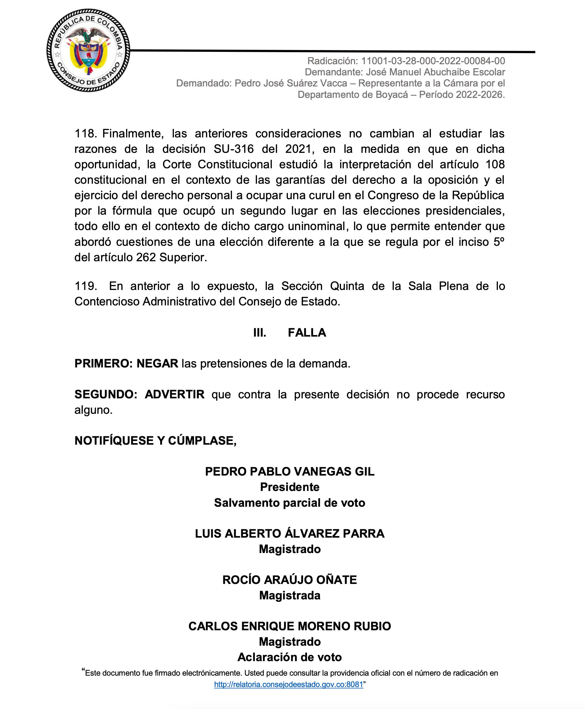 Sin embargo, luego de analizar la demanda, la Sección Quinta del Consejo de Estado, concluyó que, por un lado, no se configuró ninguna irregularidad en los votos obtenidos porque Pacto Histórico no participó en las elecciones al Congreso de la República de 2018 y tampoco hay pruebas de que se haya configurado falsedad en los formularios E26.