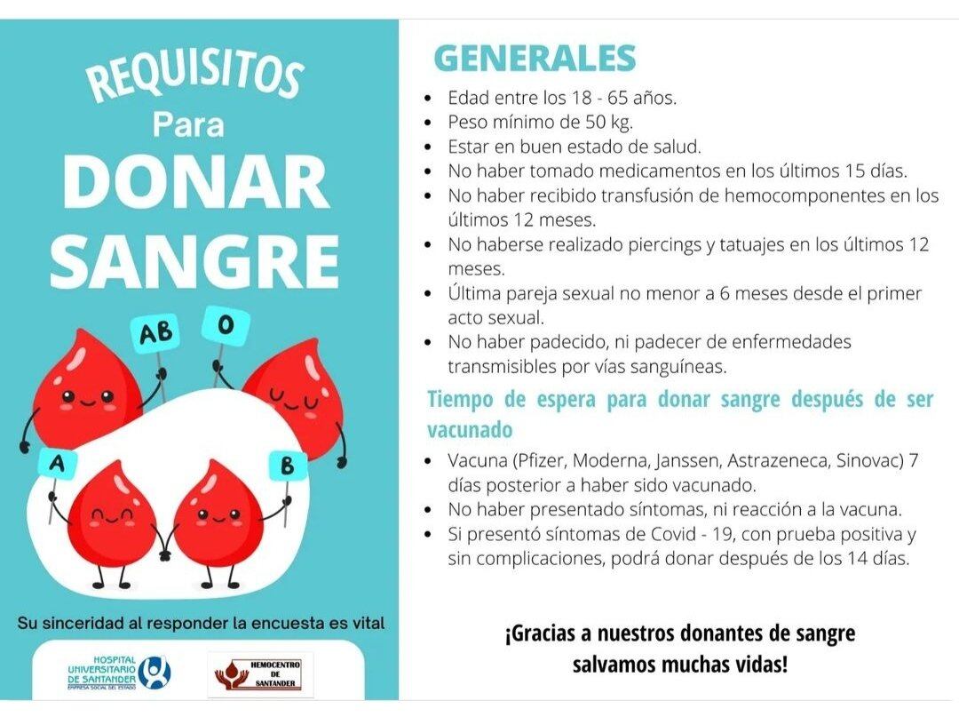 “El Hemocentro de Santander necesita de tu ayuda. En estos momentos presentamos escasez de sangre B- y 0-. Media hora de tu tiempo puede salvar vidas los esperamos en el Hemocentro de la ESE HUS para que ayuden a nuestros pacientes a través de la donación de sangre”, comunicó el HUS.