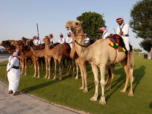 AL KHOR, QATAR - NOVEMBER 20: Qatari Amiri Guard on Camels lined up at the Qatar welcome party at the Al Bayt Stadium before the FIFA World Cup Qatar 2022 Group A match between Qatar and Ecuador at Al Bayt Stadium on November 20, 2022 in Al Khor, Qatar. (Photo by Richard Sellers/Getty Images) / Richard Sellers