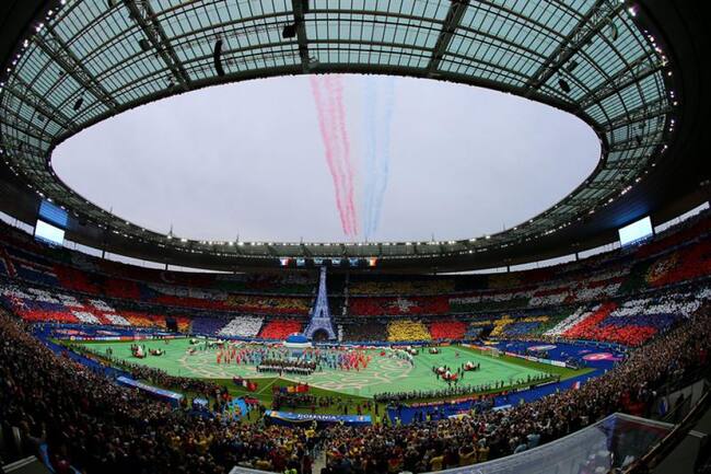 Los asistentes vieron una sucesión de coreografías en el Estadio de Francia, momentos antes del partido entre Francia y Rumanía.