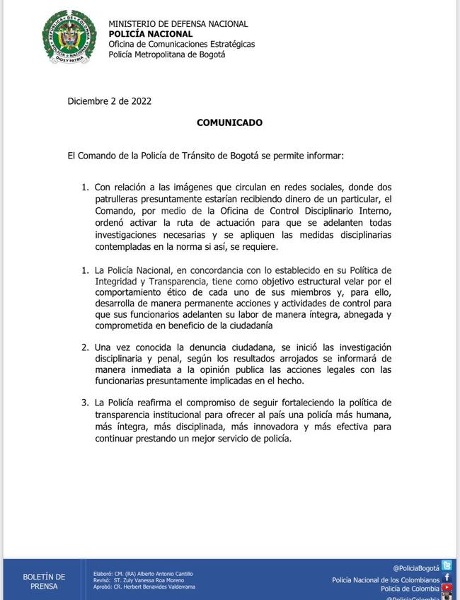 A través de un comunicado el Comando de la Policía de Tránsito aseguró que la Oficina de Control Disciplinario Interno, comenzará con la respectiva investigación de lo ocurrido y después, sea oportuno o no, se tomen las medidas disciplinarias a lugar.