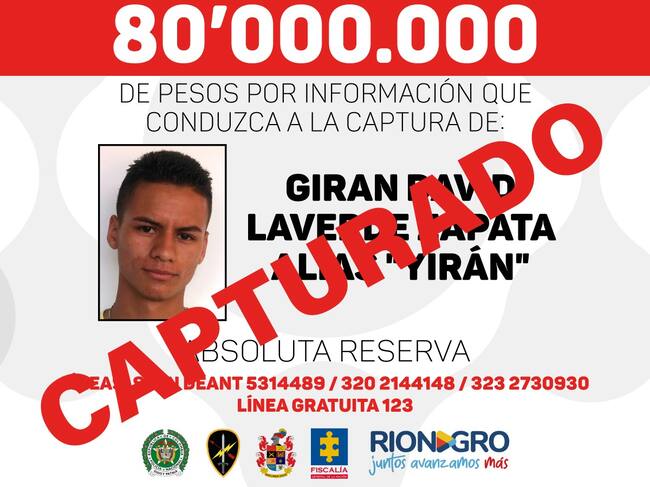 El alcalde del municipio de Rionegro, Rodrigo Hernández Alzate, confirmó que el pasado domingo fue capturado por las autoridades Giran Laverde Zapata, alias “YIRÁN” principal cabecilla del grupo ilegal “Los del Alto” y cuenta con una trayectoria criminal de más de diez años. Su detención se habría dado en el municipio se Sabaneta sur del Valle de Aburrá.
