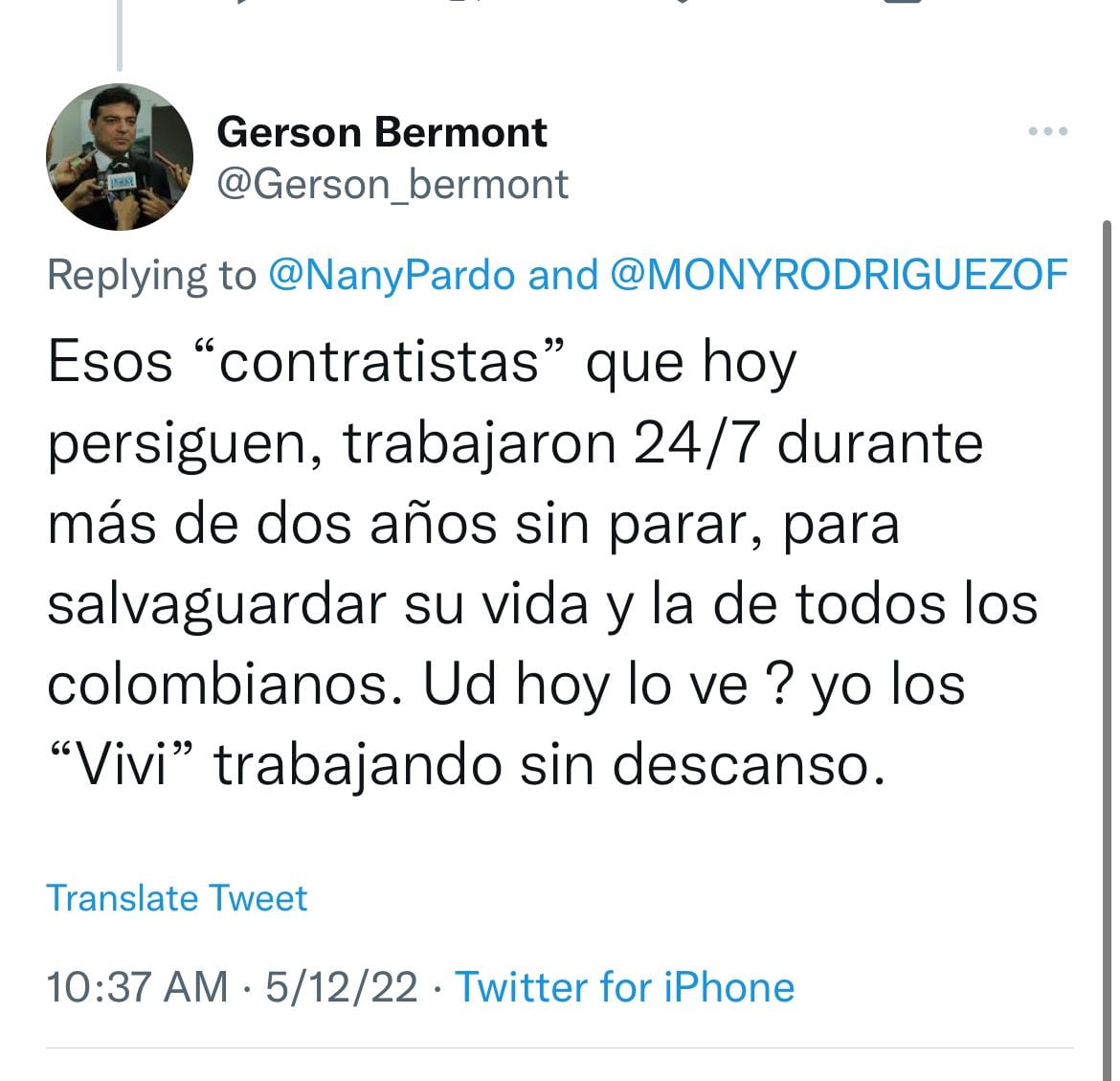 Incluso uno de los hombres protagonistas de la pandemia fue el doctor Gerson Bermont, ex director de Promoción y Prevención del Ministerio de Salud quien esta semana trinó “Esos “contratistas que hoy persiguen, trabajaron 24/7 durante más de dos años sin parar, para salvaguardar su vida y la de todos los colombianos. Ud hoy lo ve? Yo los viví trabajando sin descanso”