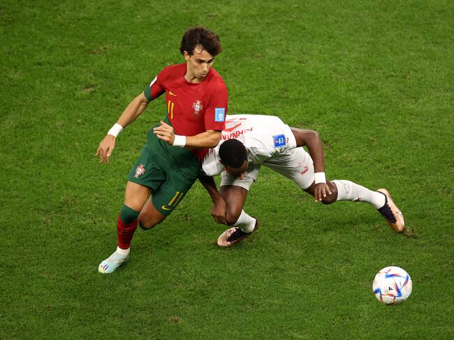 LUSAIL CITY, QATAR - DECEMBER 06: Joao Felix of Portugal battles for possession with Edimilson Fernandes of Switzerland during the FIFA World Cup Qatar 2022 Round of 16 match between Portugal and Switzerland at Lusail Stadium on December 06, 2022 in Lusail City, Qatar. (Photo by Robert Cianflone/Getty Images) / Robert Cianflone