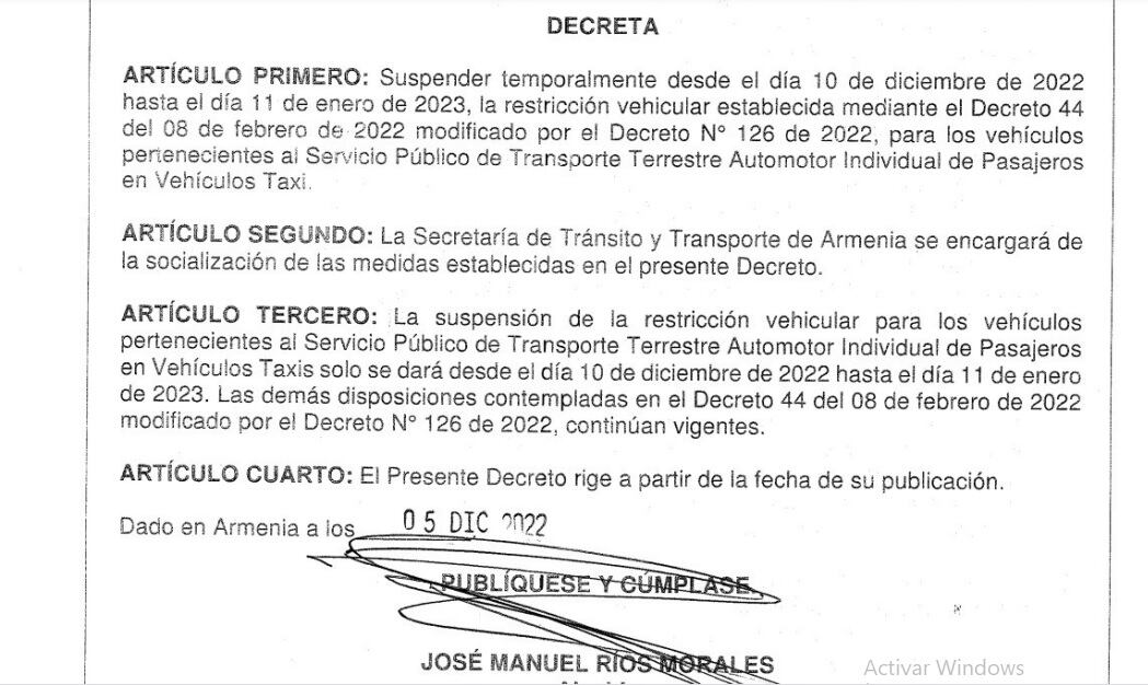 Decreto pico y placa taxis en Armenia