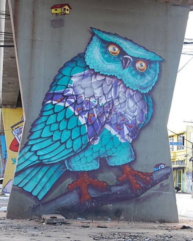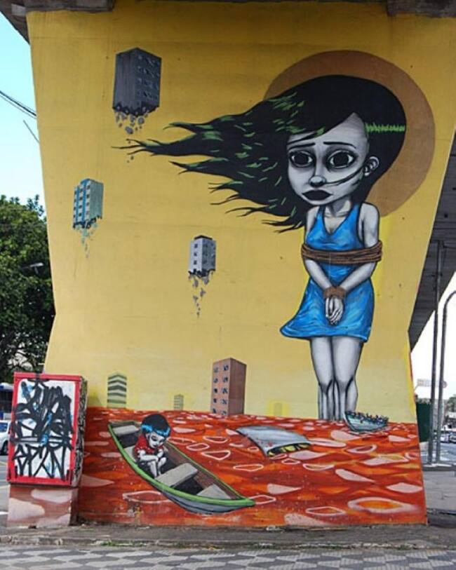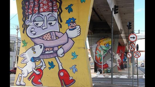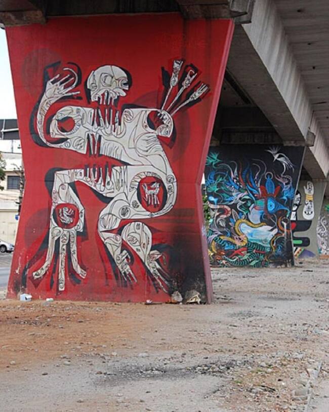 Binho Ribeiro y Chivitz empezaron a buscar colaboraciones con las autoridades locales, como el Departamento de Cultura, el Metro y el Ayuntamiento. Desde entonces, los pilares están decorados con arte callejero. En la imagen, uno de Tinho
