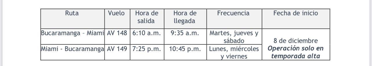 Cabe resaltar que es un vuelo temporal que inició en esta temporada decembrina, Miguel Soto, jefe de comunicaciones de aeropuerto de oriente, “Logramos con la aerolínea Avianca dar inicio a la ruta internacional Bucaramanga - Miami, inicialmente la ruta lo plantea para temporada alta o vacacionales que tendrá un piloto ubicado en el mes de diciembre de este año, estamos proyectando que en el mes de enero finalizaría la primera etapa de este vuelo piloto para una proyección hacia el 2023 de convertir en un posible escenario permanente”