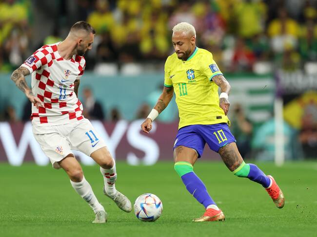 AL RAYYAN, QATAR - DECEMBER 09: Neymar of Brazil controls the ball against Marcelo Brozovic of Croatia during the FIFA World Cup Qatar 2022 quarter final match between Croatia and Brazil at Education City Stadium on December 09, 2022 in Al Rayyan, Qatar. (Photo by Lars Baron/Getty Images) / Lars Baron