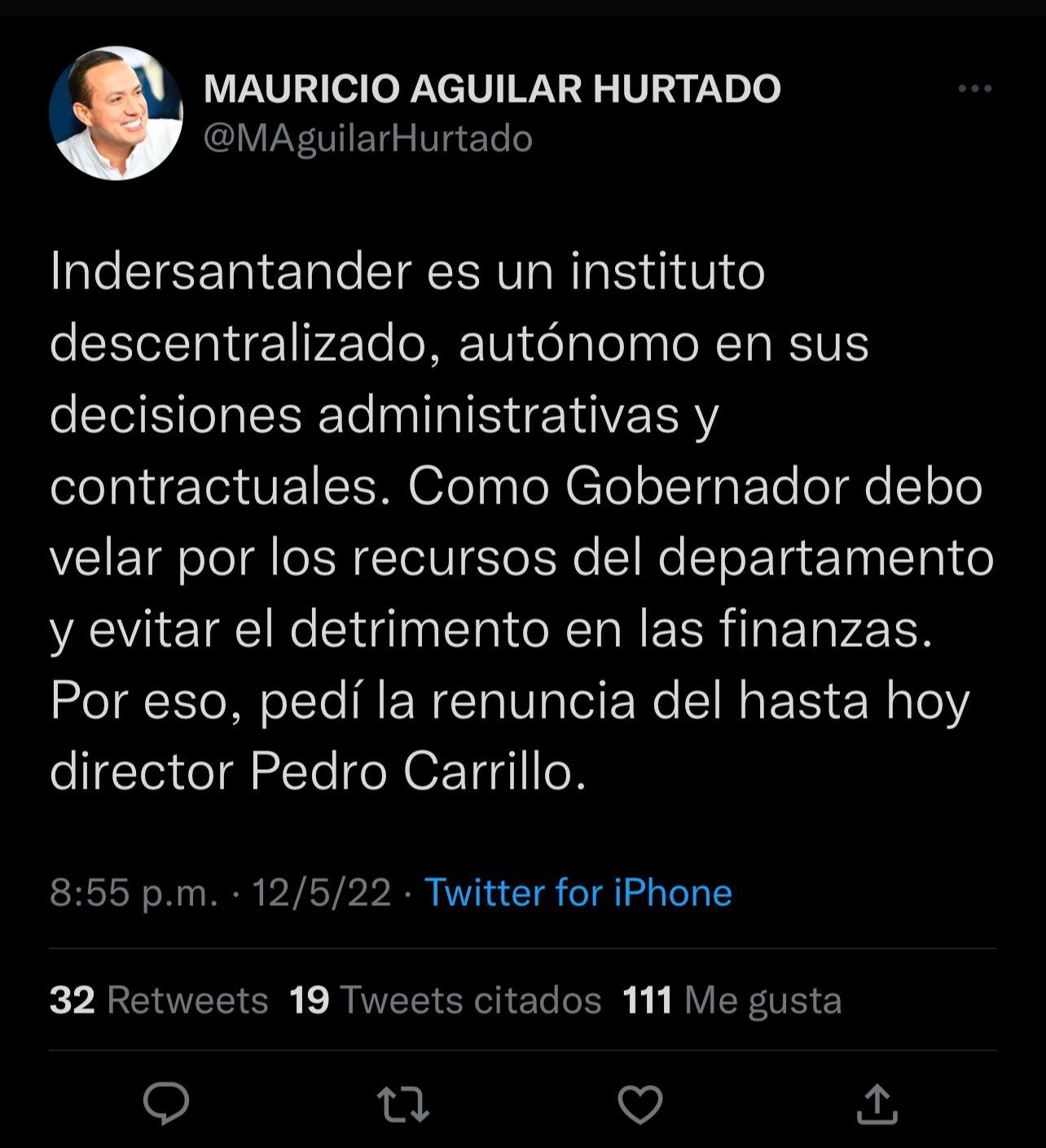 Arias hace referencia al trino del gobernador de Santander, Mauricio Aguilar, quien hace unos días había ordenado la renuncia de Pedro Carrillo como director del Indersantander y pese a esta situación, Carrillo continúa realizando labores.