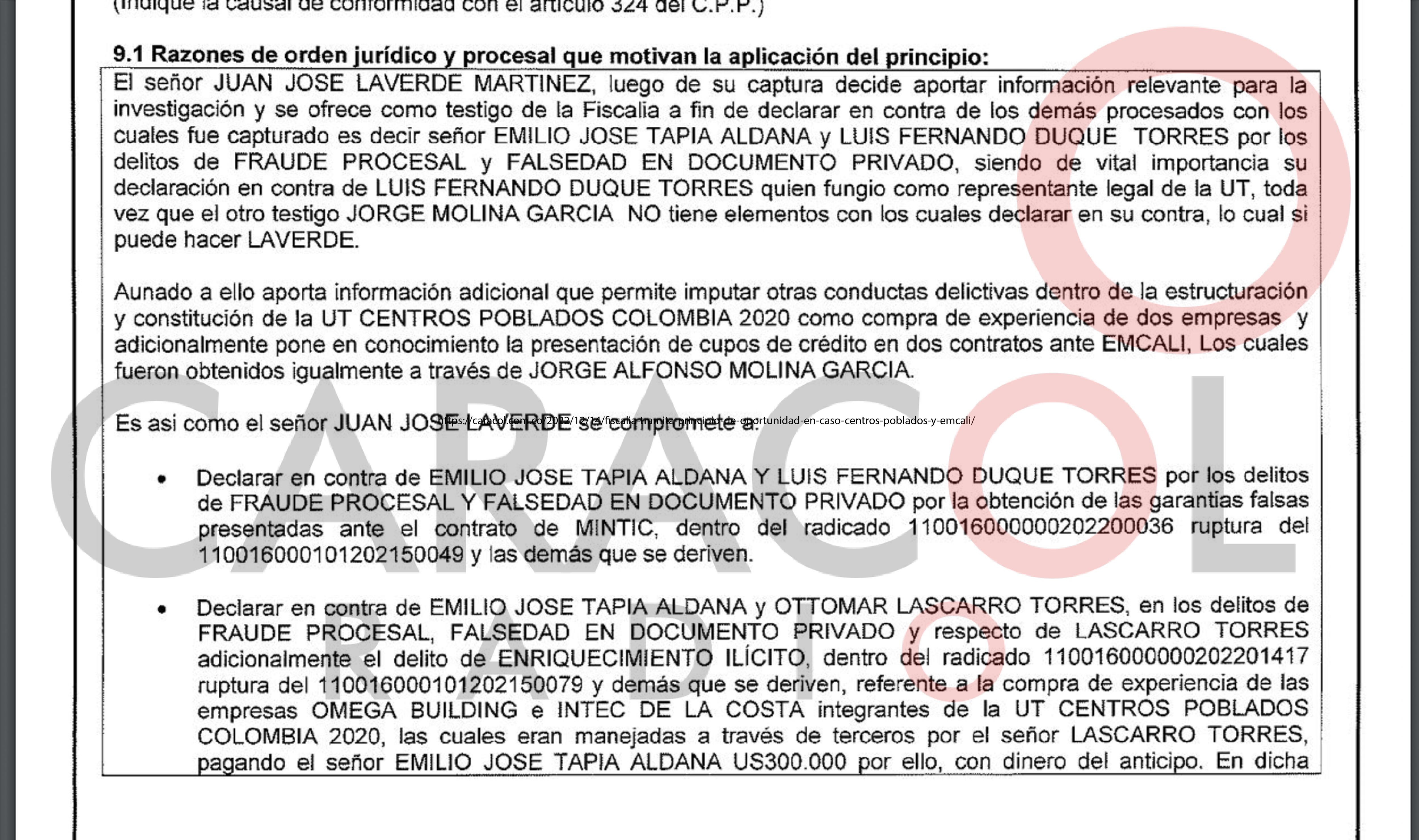 El documento de 11 páginas en poder de Caracol Radio, indica que Juan José Laverde, luego de ser capturado, se ofreció como testigo y aportó información relevante que permitió a la Fiscalía capturar a Emilio Tapia y a Luis Fernando Duque, exrepresentante de la Unión Temporal Centros Poblados.