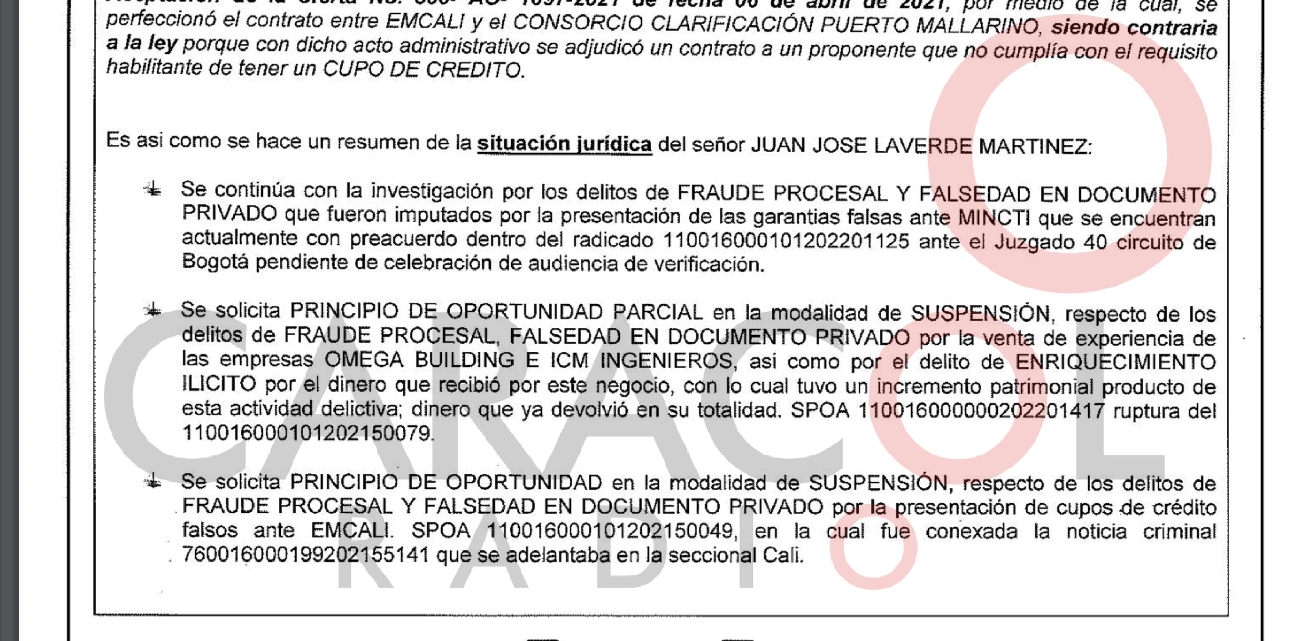 También se solicita principio de oportunidad total por los delitos de fraude procesal y falsedad en documento privado por los cupos de crédito falsos en el caso de EMCALI