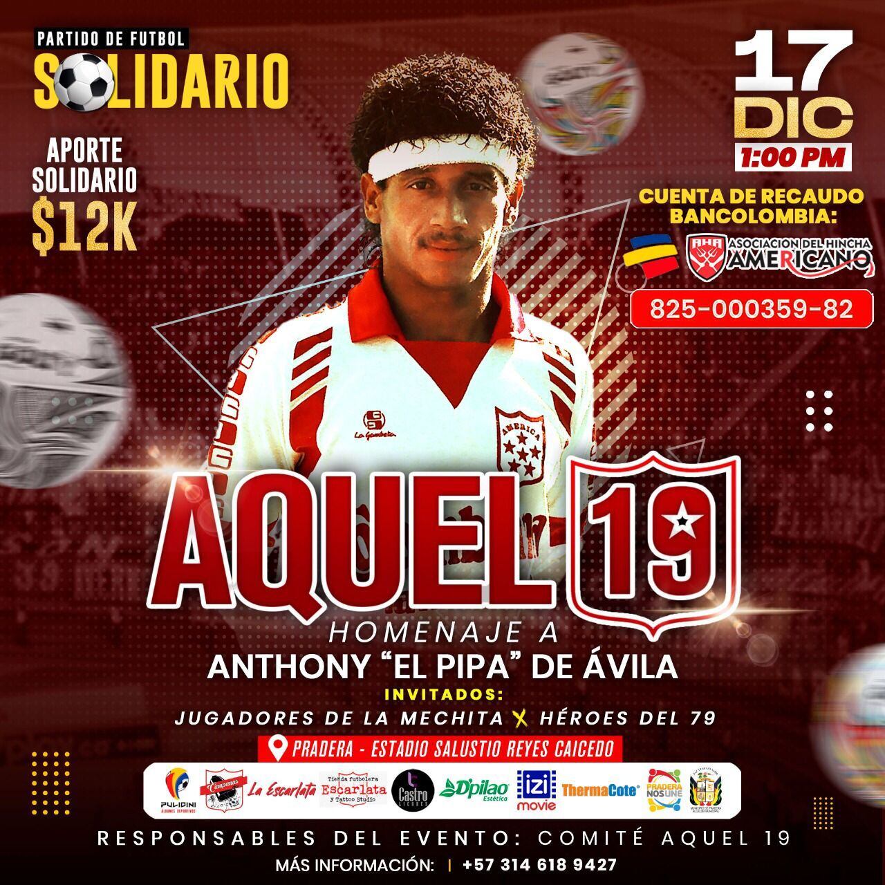 Bajo el lema “Juntos somos Pipa”, el comité ‘Aquel 19′, responsables del evento, anunciaron que para los seguidores del fútbol que deseen asistir y/o dejar su aporte solidario, podrán participar entregando una cuota de 12 mil pesos colombianos que podrán ser consignados a la cuenta Bancolombia #825-000359-82.