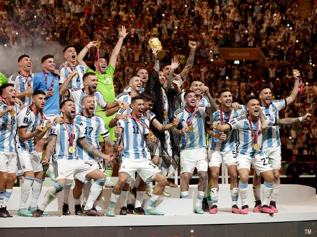 LUSAIL CITY, QATAR - DECEMBER 18: Lionel Messi of Argentina and team celebrate after winning the FIFA World Cup Qatar 2022 Final match between Argentina and France at Lusail Stadium on December 18, 2022 in Lusail City, Qatar. (Photo by Richard Sellers/Getty Images) / Richard Sellers
