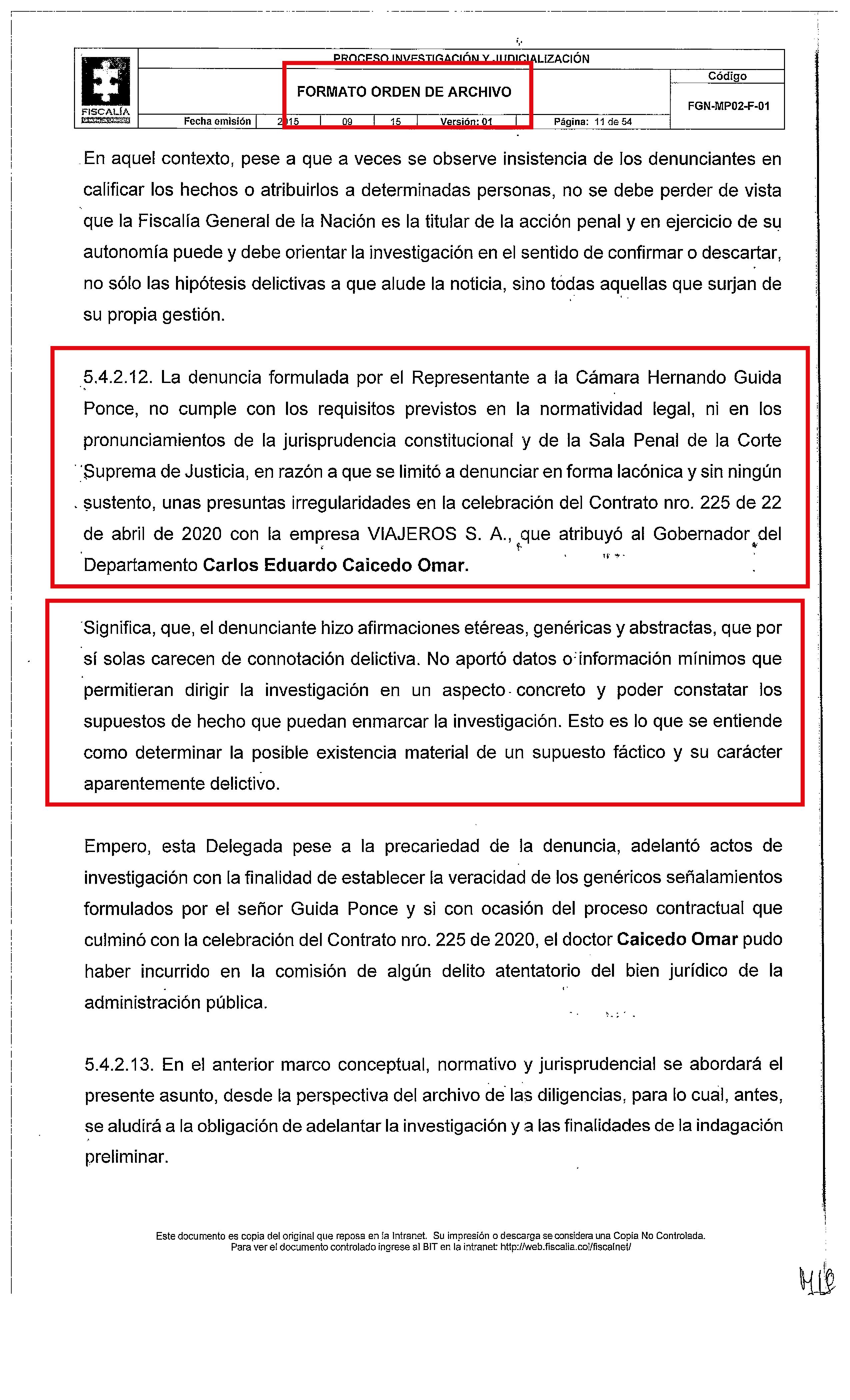 “Se concluye que: Carlos Eduardo Caicedo en su condición de gobernador del Magdalena no incurrió en el delito de contrato sin cumplimiento de requisitos legales, dado que, las afirmaciones del denunciante no hallaron justificación en esta investigación”, recalcó el ente acusador.