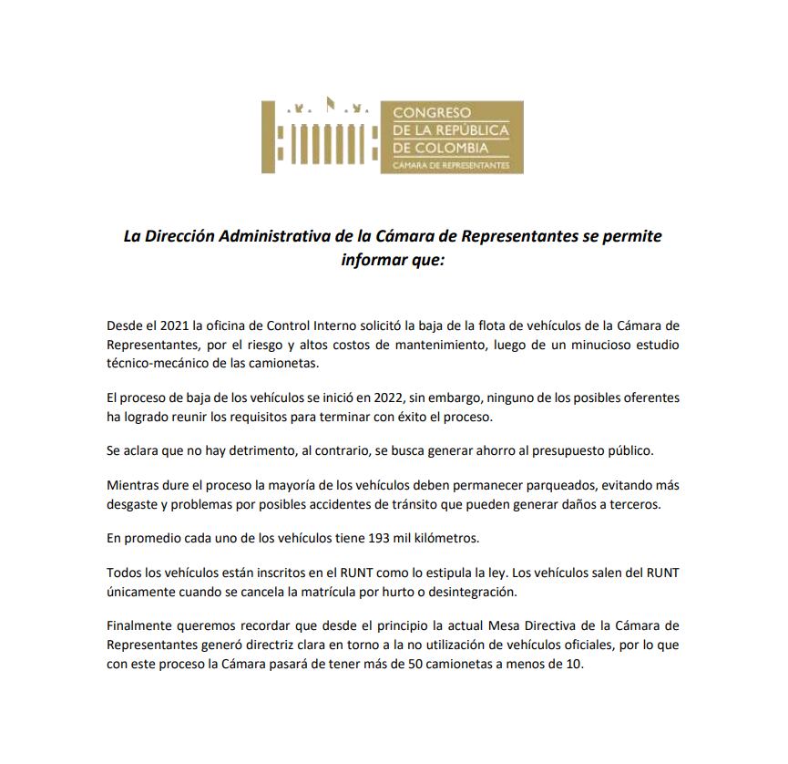 Adicionalmente recuerdan que desde la Mesa Directiva de la Cámara de Representantes se dio una directriz en la no utilización de vehículos oficiales, por lo que el proceso de cambio generará que la Cámara pase de tener 50 camionetas a menos de 10.