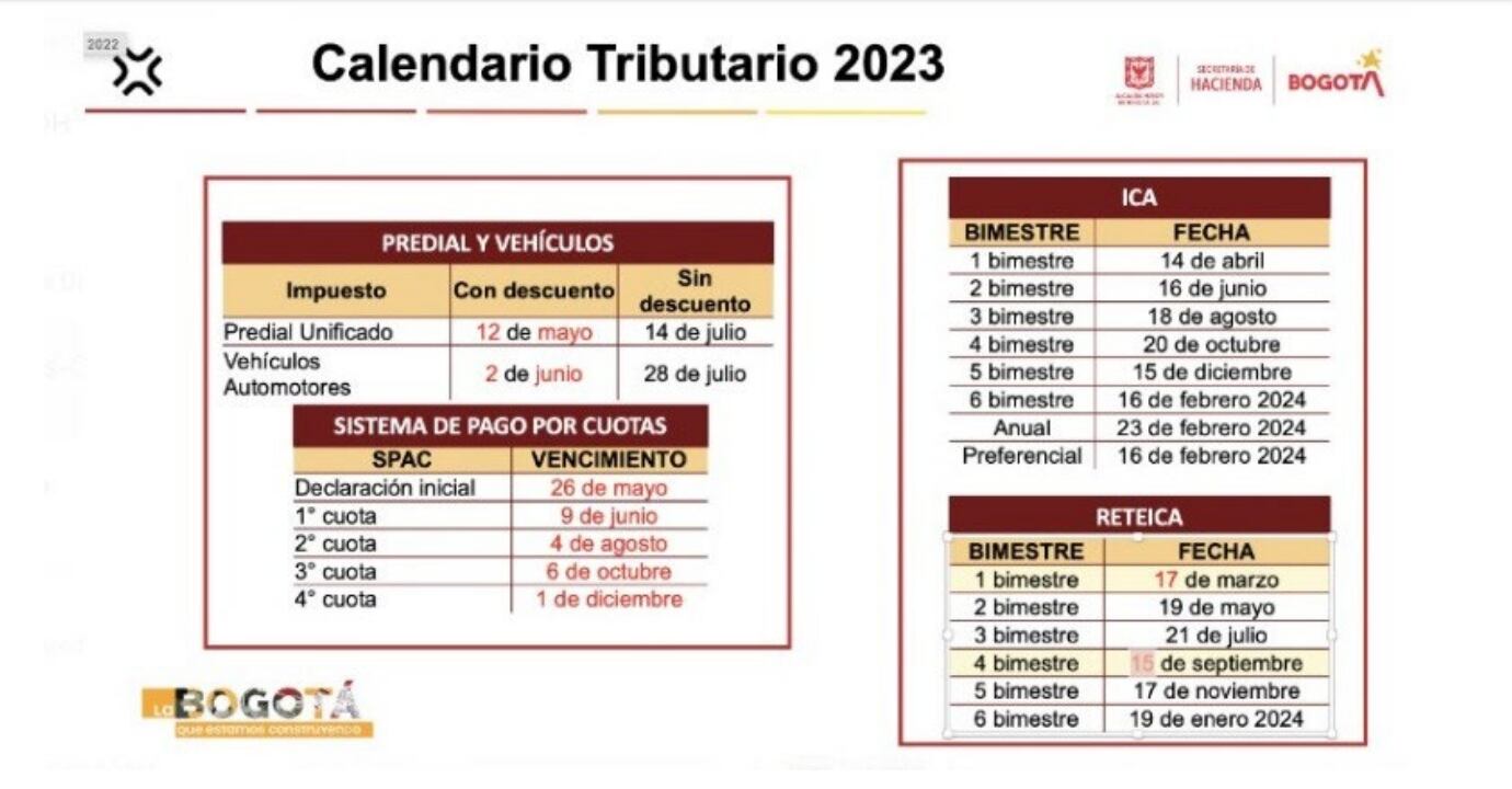 El Distrito confirmó el calendario tributario de Bogotá para el 2023, entre los que se establecen fechas de la declaración y los pagos para impuesto predial, vehicular e Industria y Comercio.