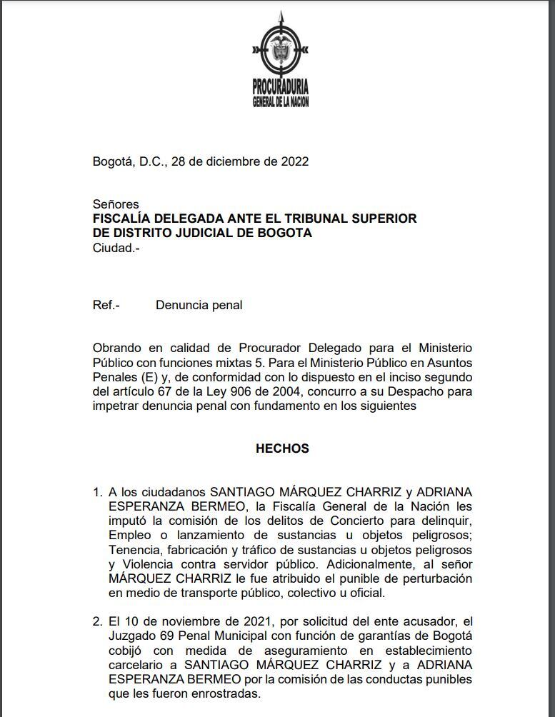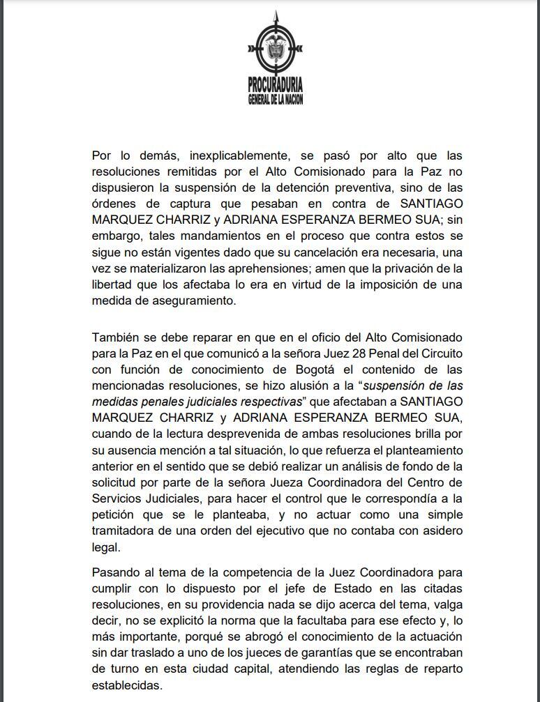 Alega la Procuraduría que la funcionaria judicial ordenó la libertad de Santiago Márquez Chárriz y Adriana Esperanza Bermeo Sua, nombrados por el gobierno “gestores de paz”, sin tener la facultad para otorgar ese beneficio.