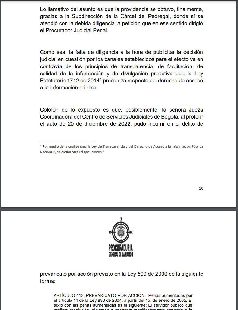 La denuncia de la Procuraduría ante la Fiscalía en contra de la jueza coordinadora del Centro de Servicios Judiciales del complejo judicial de Paloquemao