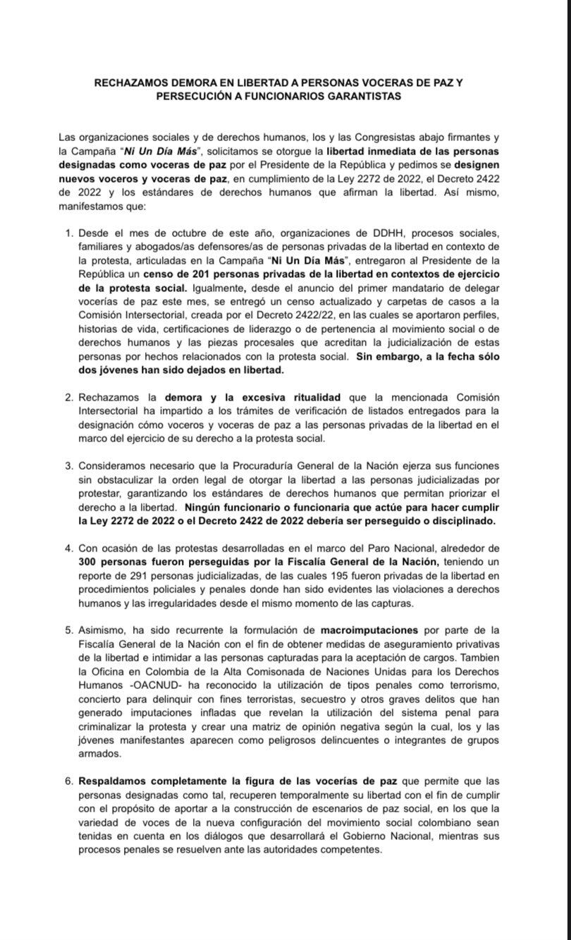 “Rechazamos la demora y la excesiva ritualidad que la mencionada Comisión Intersectorial ha impartido a los trámites de verificación de listados entregados para la designación cómo voceros y voceras de paz a las personas privadas de la libertad en el marco del ejercicio de su derecho a la protesta social”, versa el comunicado.