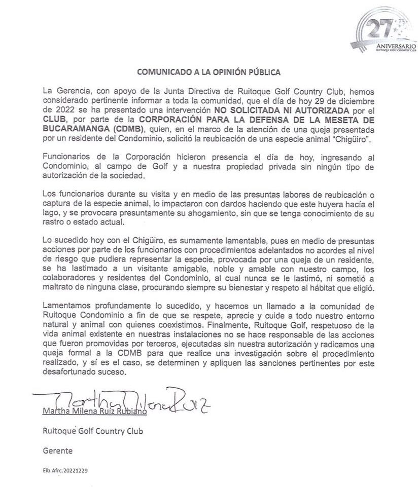 A través de un comunicado Ruitoque Golf Country Club rechazó la acción realizada por trabajadores de la Corporación para la Defensa de la Meseta de Bucaramanga (CDMB) que habría causado la muerte de un chigüiro que estaba hace varios días dentro de sus instalaciones.
