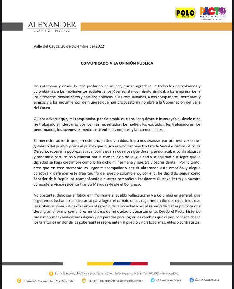 El senador del Polo Democrático, Alexander López, confirmó que seguirá ocupando su curul en el Senado, confirmando que no será candidato a la Gobernación del Valle de 2023.