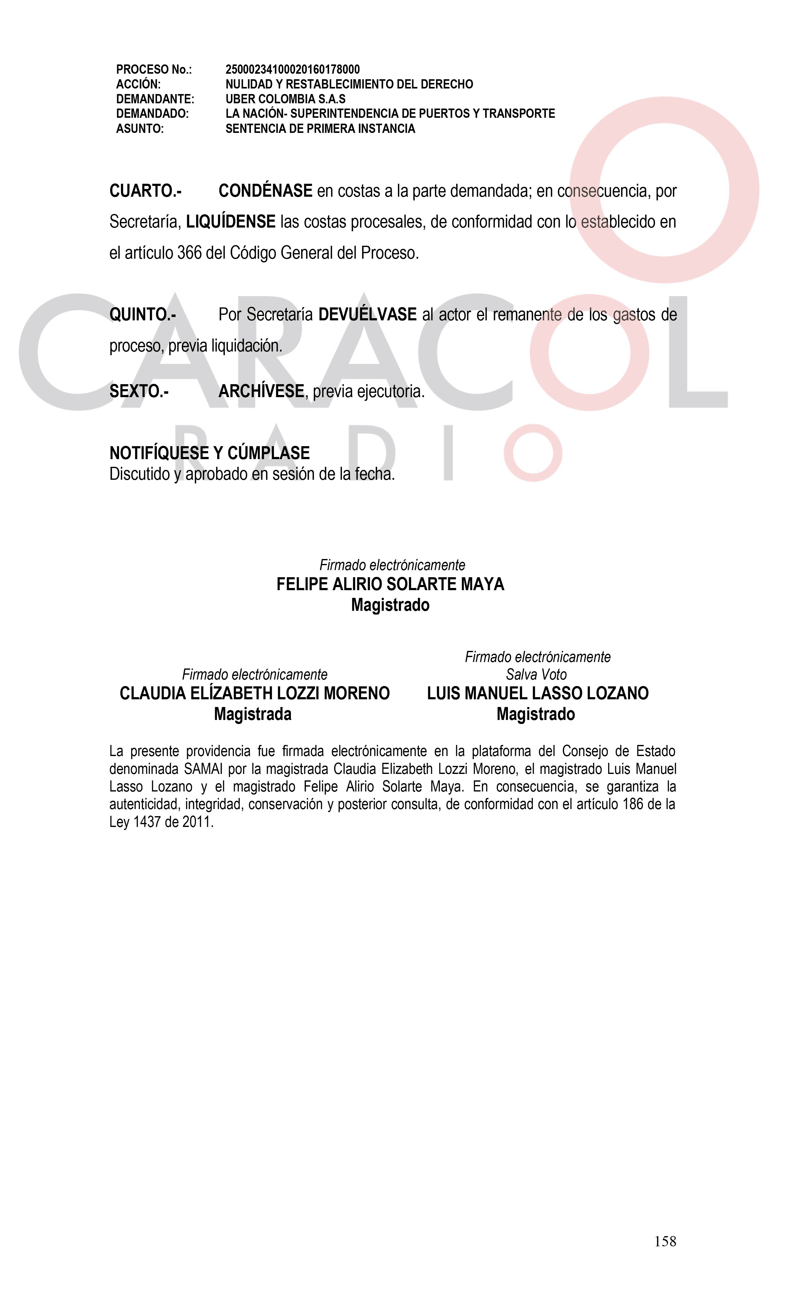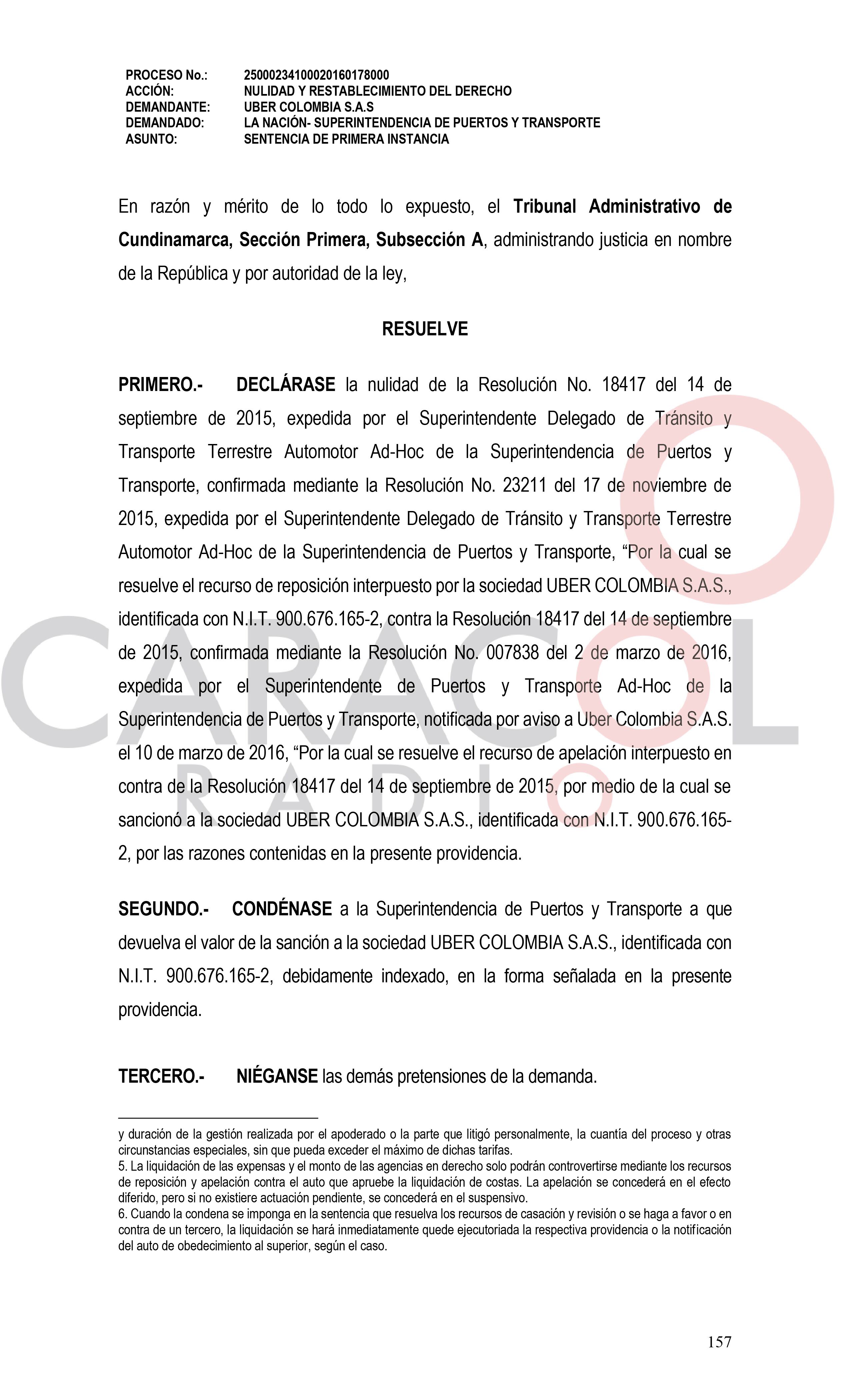 Como consecuencia de ello, El Tribunal ordenó a la Supertransporte devolver a Uber Colombia S.A.S., la suma de cuatrocientos cincuenta y un millones cuarenta y cinco mil pesos ($451.045.000), la cual fue pagada por Uber Colombia S.A.S. el 11 de marzo de 2016 como sanción que le impuso en ese momento la Supertransporte.