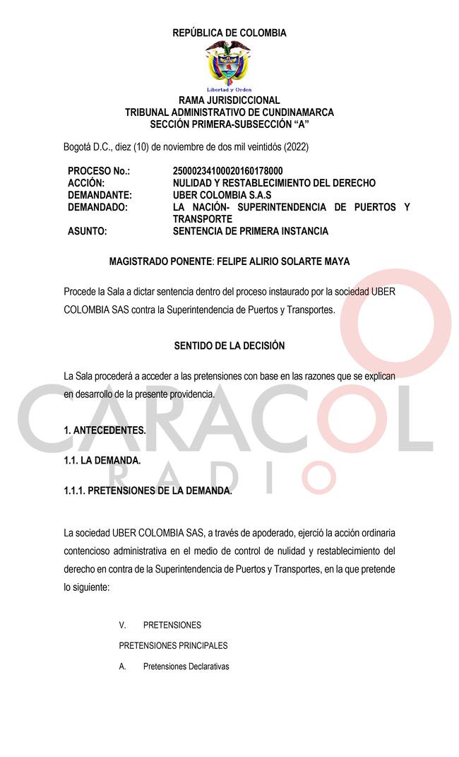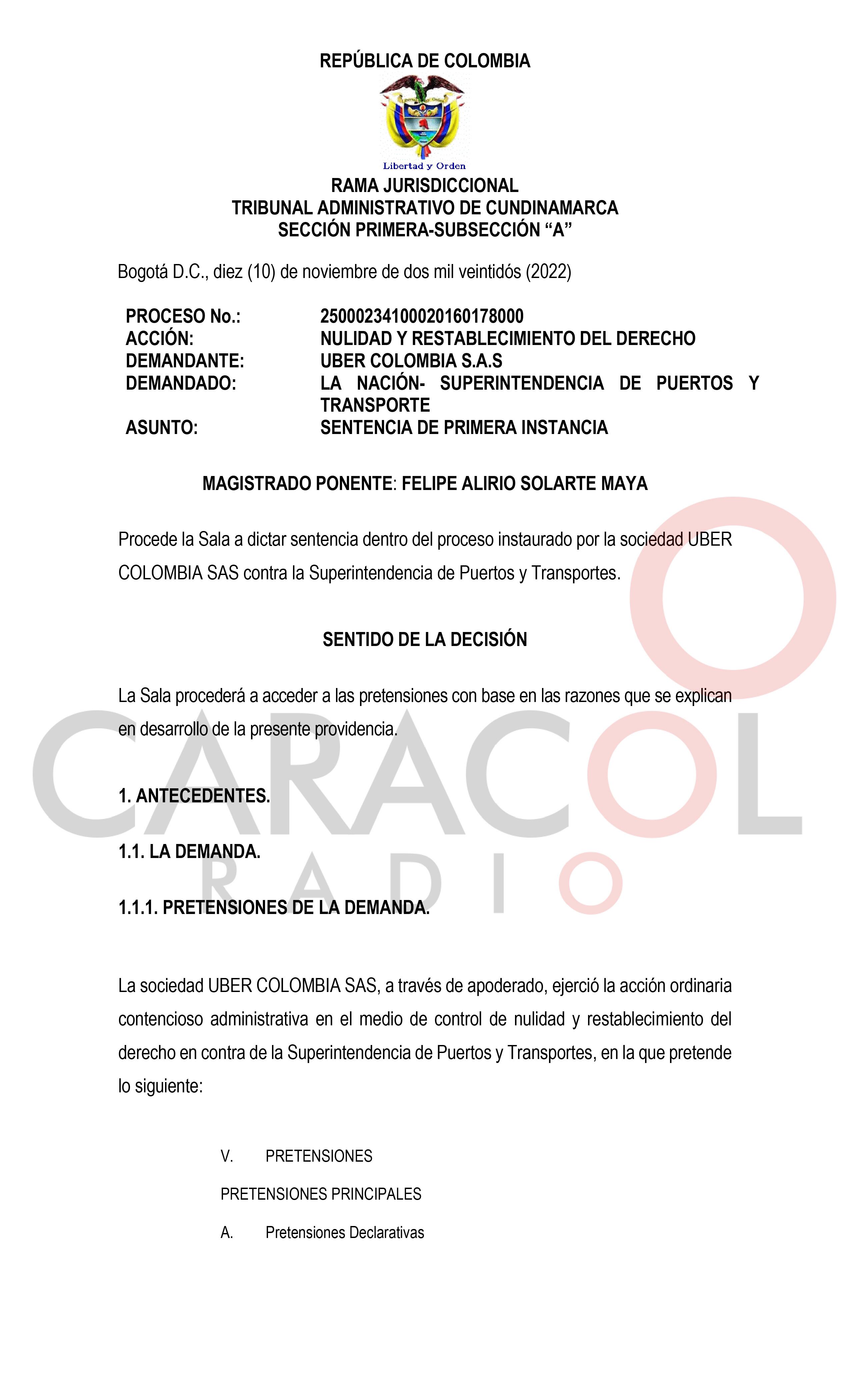 Caracol Radio conoció que el Tribunal Administrativo de Cundinamarca tumbó todas las sanciones que la Superintendencia de Transporte impuso a UBER Colombia SAS y como consecuencia de ello de devolver a $451 millones con los respectivos intereses que esa plataforma pagó como sanción en 2016.