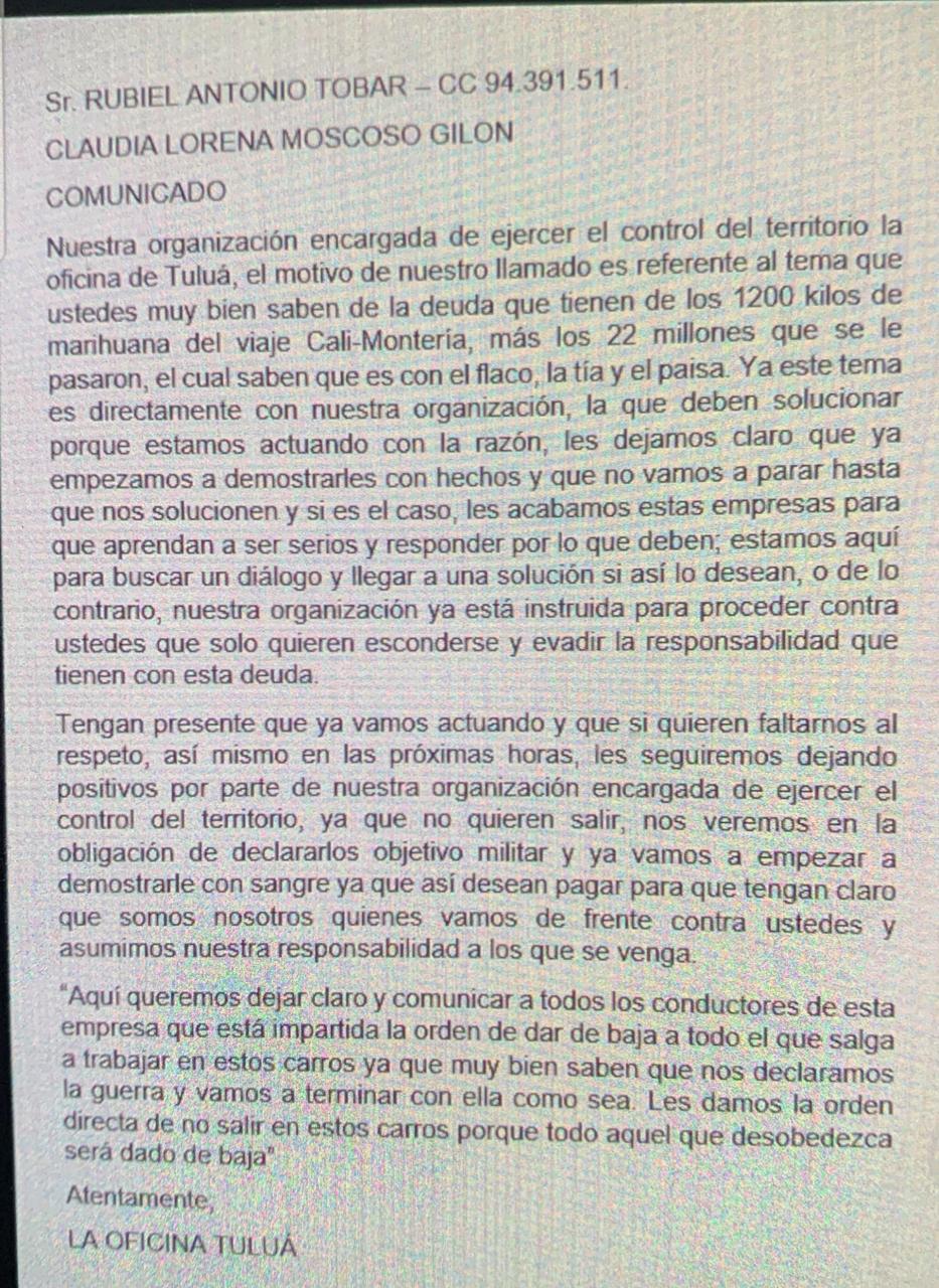 La empresa ha recibido varios panfletos amenazantes en los que ‘La Oficina’ de Tuluá les prohíbe a los conductores salir a trabajar.