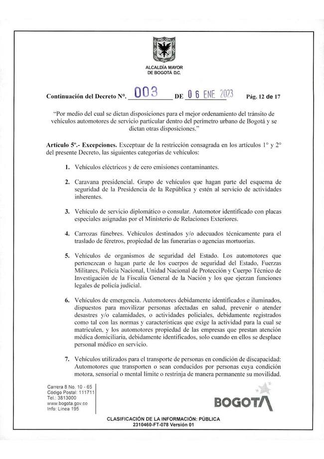 Según el decreto, los vehículos que obtengan la excepción por pago, “esta será válida una vez el registro del vehículo se encuentre confirmado en la plataforma dispuesta por la Secretaría Distrital de Movilidad para tal fin”.