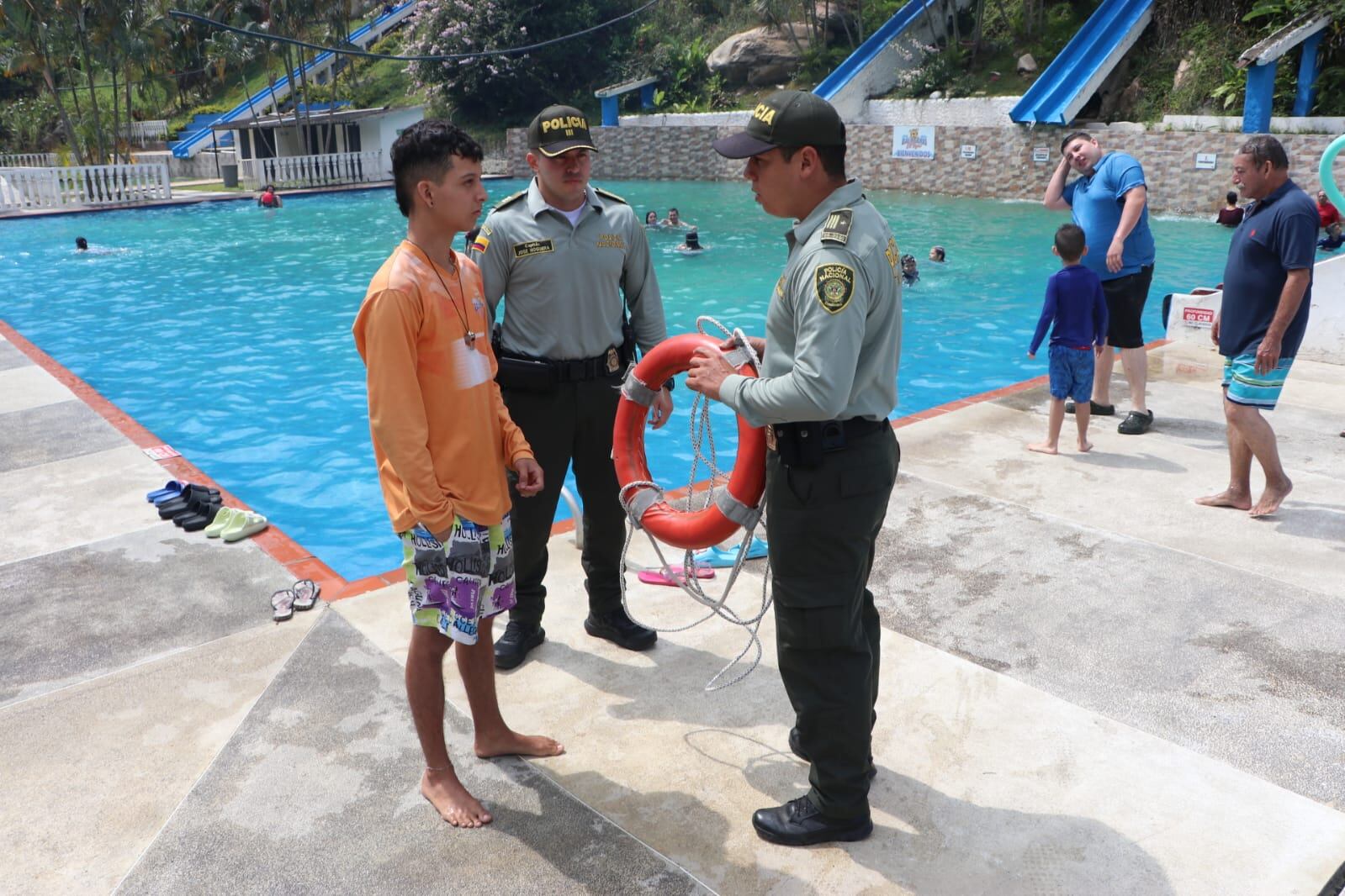 “El grupo de protección al turismo y patrimonio nacional de la metropolitana de Bucaramanga nos encontramos realizando registros y controles en los establecimientos, balnearios, ríos, quebradas, con el fin de garantizar que las personas tengan tranquilidad y darle una serie de recomendaciones como que no ingerir bebidas embriagantes en las piscinas, verificar que estas cuenten con la documentación exigida para su funcionamiento. Lo importante para las personas es que no descuiden sus niños. Si pueden ver en la piscina tienen un área establecida con el tema de la profundidad.”