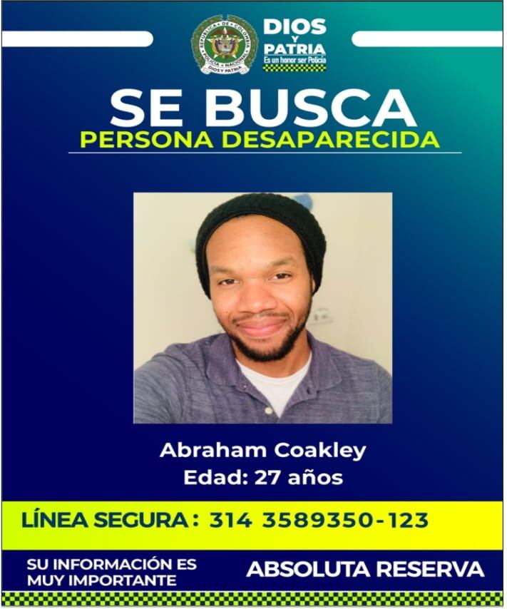 Además, “se consulta información en trece empresas de transporte intermunicipal para corroborar si han visto o transportado a la persona objeto de la búsqueda sin obtener resultado. Igualmente, por orientación de la señora madre su hijo puede presentar fatiga y pérdida de memoria por ausencia de una vitamina en su cuerpo, se publica la fotografía de Abraham Coakley por autorización de sus familiares para una pronta ubicación”.