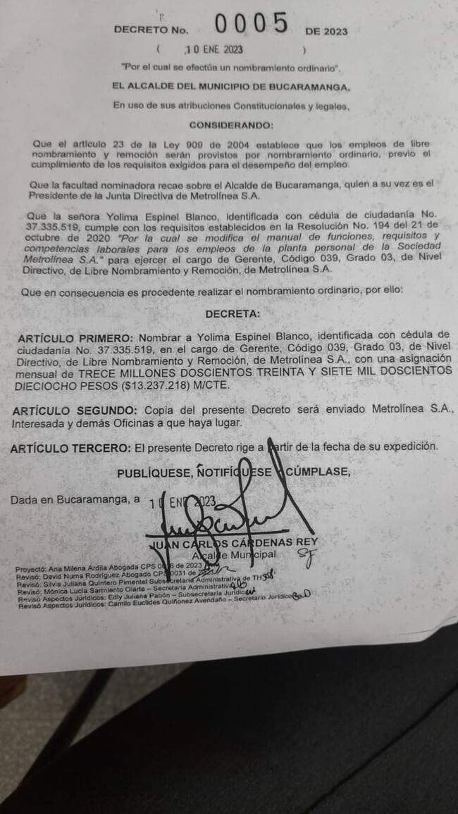 Yolima Espinel Blanco es la nueva gerente del Metrolinea, según el decreto 0005 del presente año firmado hoypor el alcalde de Bucaramanga, Juan Carlos Cárdenas en donde la nombra en este cargo.