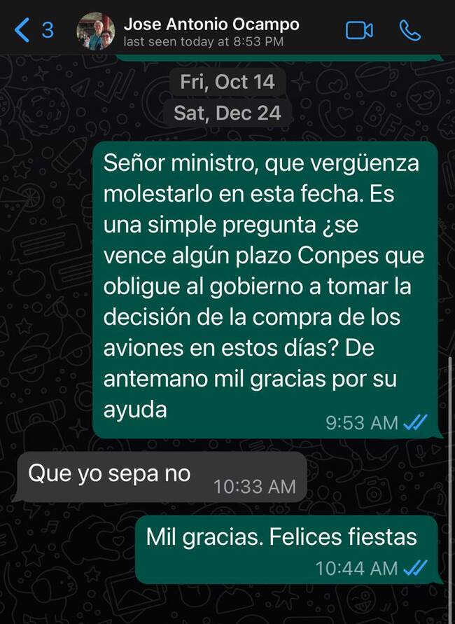 -Señor ministro que vergüenza molestarlo en esta fecha. Es una simple pregunta ¿Se vence algún plazo Conpes que obligue al gobierno a tomar la decisión de la compra de los aviones en estos días? De antemano, mil gracias por su ayuda.