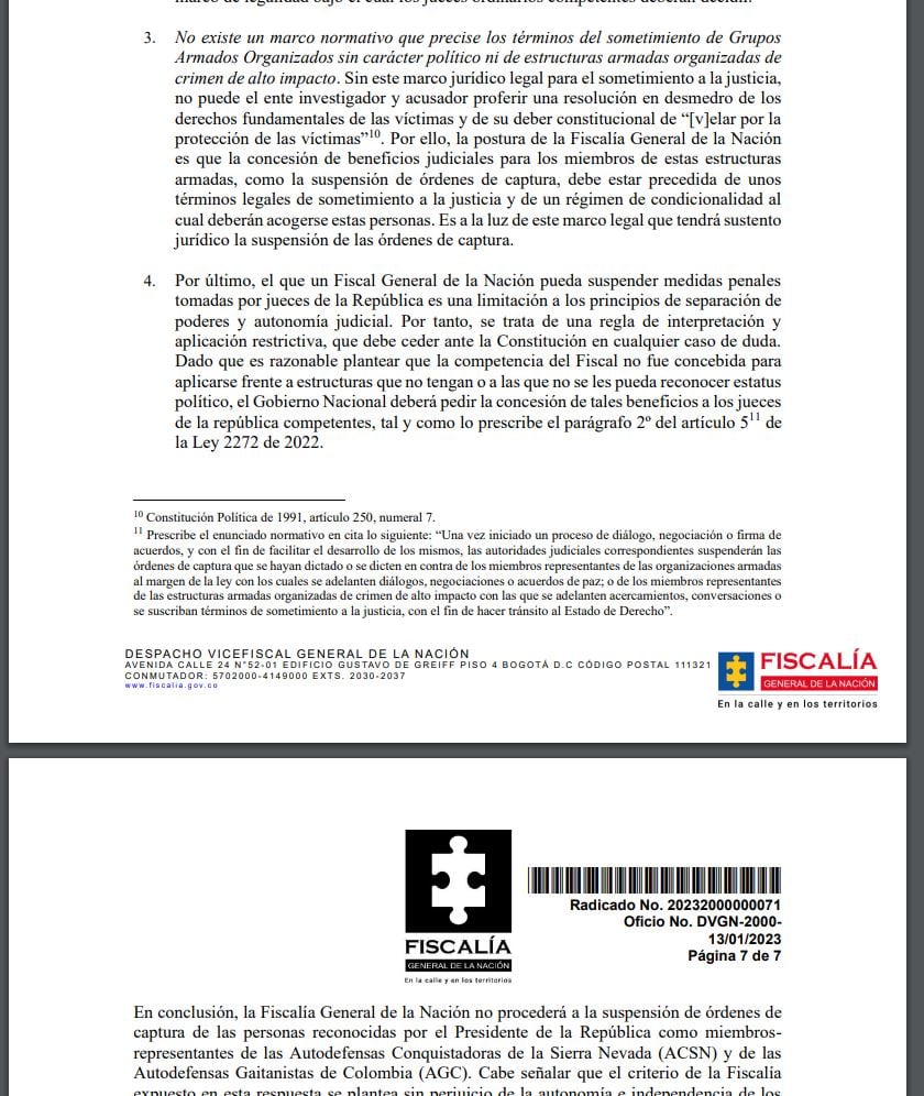 “Las reglas para suspender órdenes de captura a miembros de grupos armados organizados de carácter político con los que se adelanten diálogos en los que se pactarían acuerdos de paz no son las mismas que rigen para estructuras criminales con vocación de sometimiento a la justicia”. Dice el ente acusador.