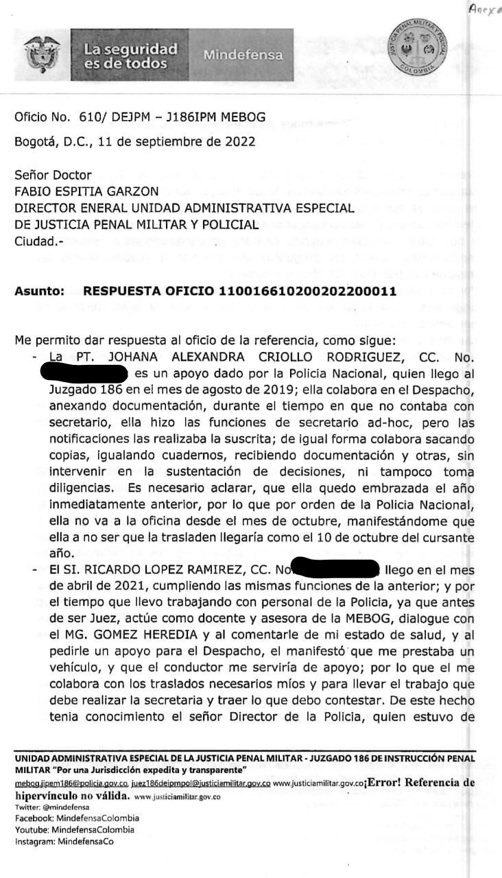 Se trata de la patrullera Johana Alexandra Criollo y el subintendente Ricardo López Ramírez, que figuraban como “secretarios ad-hoc”. En un documento que conoció Caracol Radio del 11 de septiembre de 2022, la exjuez Castaño reconoció que tenía el aval de la Policía Nacional para tenerlos en su despacho.