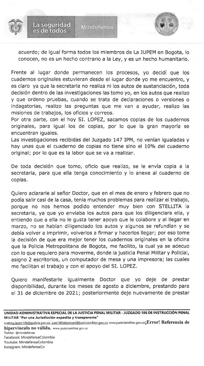 Ahora, sobre el subintendente Ricardo López Ramírez, la Mebog asegura que entre el 12 de marzo de 2021 y el 21 de diciembre de 2022 figuró como integrante de la Fuerza Disponible de la Policía Metropolitana de Bogotá. Lo que no menciona es que desde abril de 2021 empezó como secretario ad hoc en el despacho 186, como dice la exjuez, notificando decisiones judiciales como denunciaron la Procuraduría y el abogado William Lancheros.