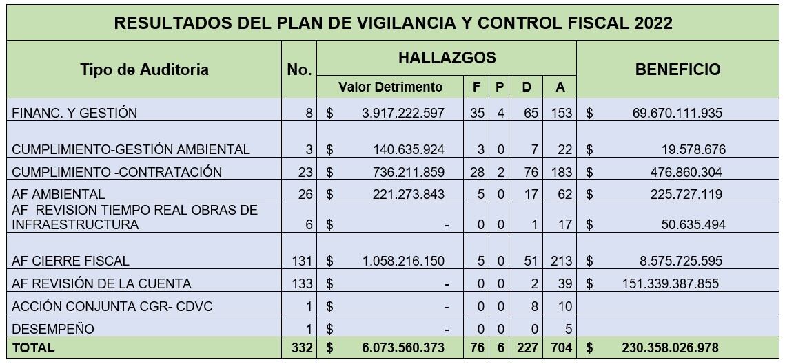 Las auditorias fueron financieras y de Gestión, de cumplimiento en gestión contractual y ambiental, actuaciones de fiscalización ambientales, revisión en tiempo real obras de infraestructura, actuaciones de fiscalización de Cierre Fiscal y de revisión de la Cuenta.