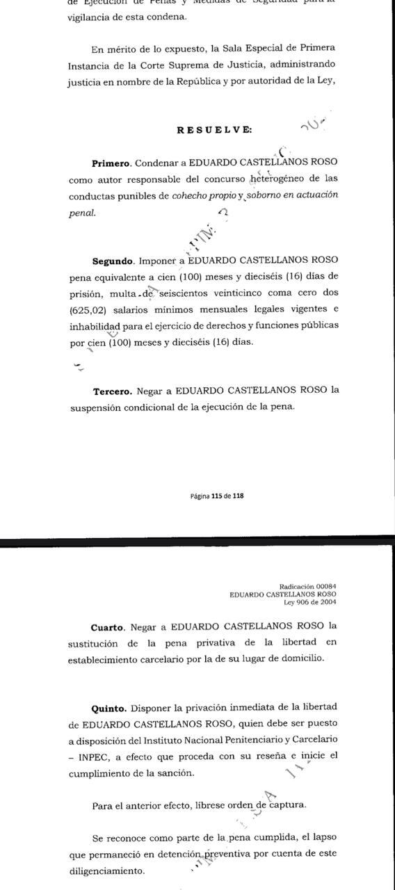 La sala primera demostró que, entre los años 2013 y 2016, el ex magistrado Castellanos, recibió dinero por un monto aproximado de 50.000 mil dólares, por parte de Marco Tulio Quintero, abogado del narcotraficante, Miguel Ángel Melchor, alias “Mellizo”, para verse beneficiado en el sistema de Justicia y Paz, en donde estaba postulado.
