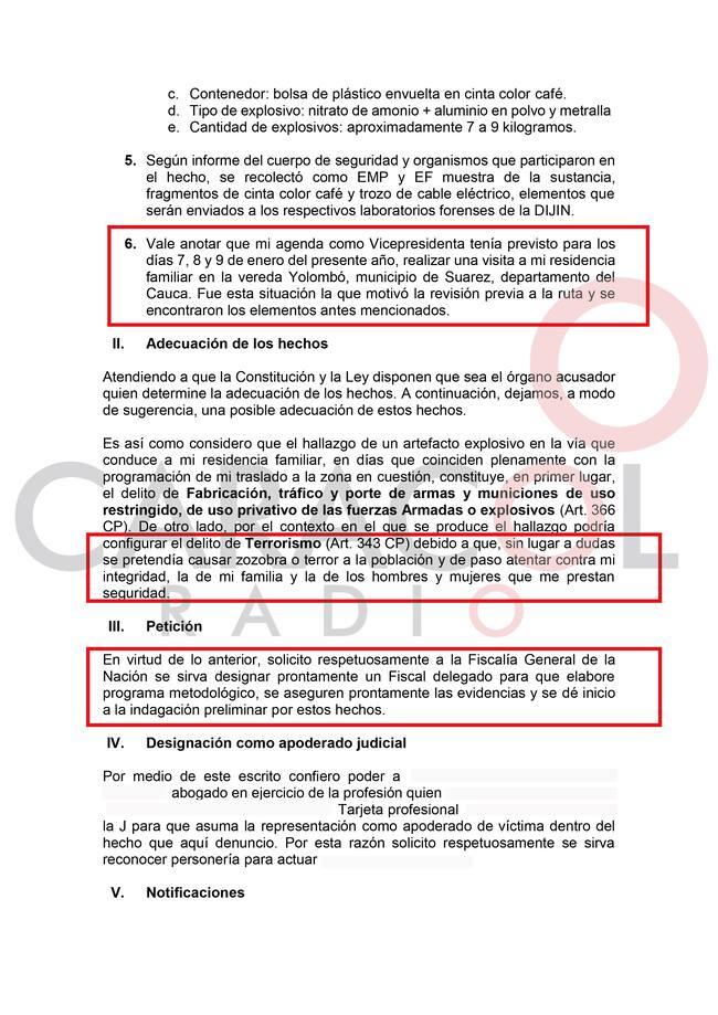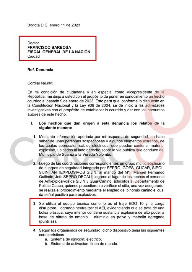 En un documento de tres páginas, dirigido al Fiscal General Francisco Barbosa, la vicepresidenta Francia Márquez pidió que se designe a un fiscal delegado para ese caso y se de inicio a la indagación preliminar para dar con los responsables de ese intento de atentado.