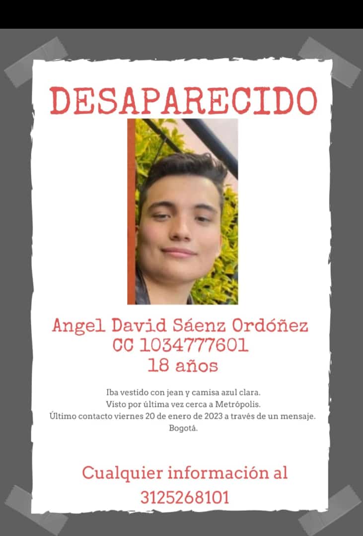Los padres de Ángel David Sáenz Ordoñez, un joven de 18 años, denuncian que su hijo está desaparecido desde el pasado viernes 20 de enero a la 1:30 de la tarde.