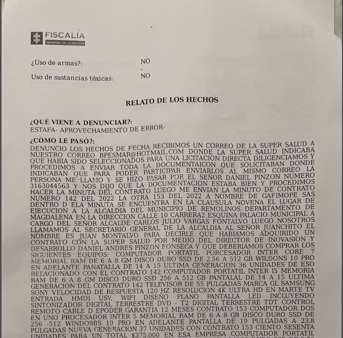 Viajó a Bogotá a reunirse con funcionarios de la SuperSalud y allá le ratificaron que fue víctima de una estafa, porque esa entidad nada tiene que ver con ese negocio.