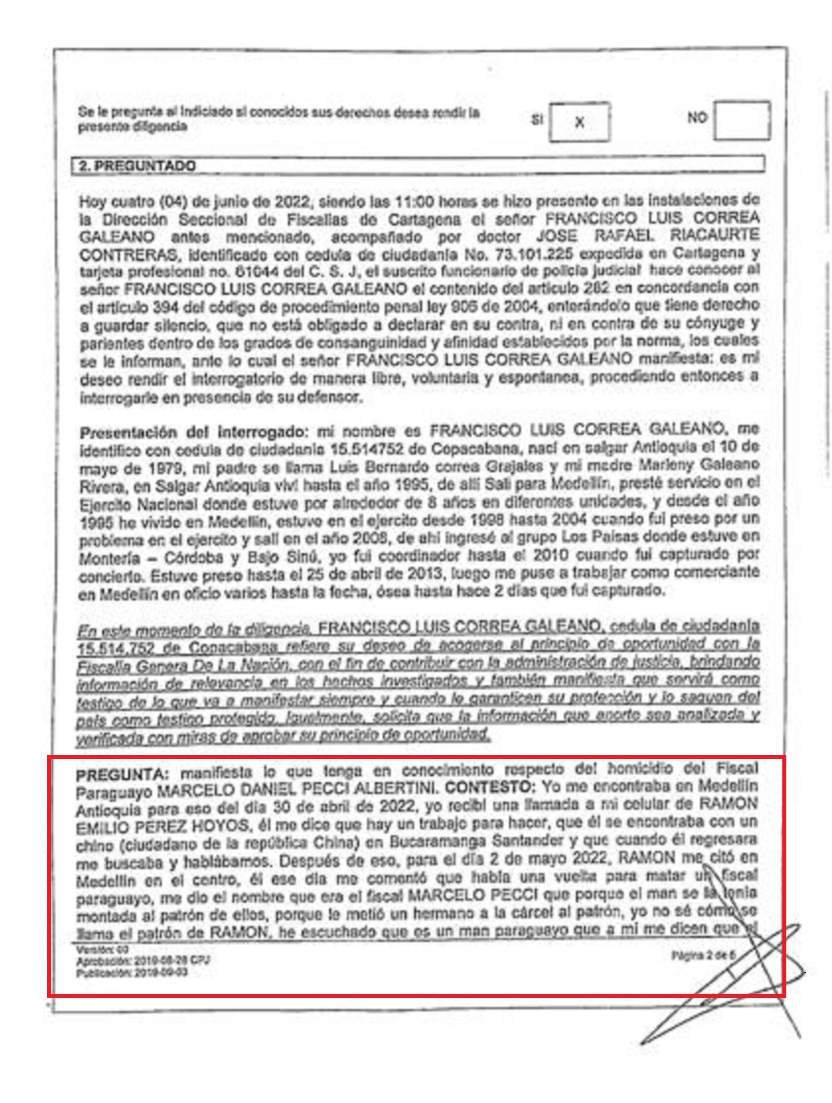 Interrogatorio de Francisco Luis Correa ante la Fiscalía de Colombia por el crimen del fiscal Pecci