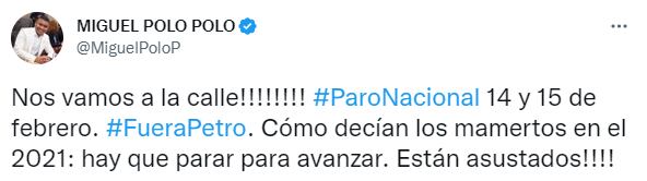 La polémica inició a través de los trinos del representante Miguel Polo Polo, quien tomó la iniciativa de convocar a los colombianos a una movilización masiva y al cese de las actividades económicas, esto en contra de las reformas que propone el gobierno del Presidente Gustavo Petro en temas como salud, pensión y soberanía energética, el próximo 14 y 15 de febrero; fecha en la que el mandatario también hizo un llamado a la ciudadanía a encontrarse en plaza pública para discutir los proyectos que están en la agenda para su ejecución.