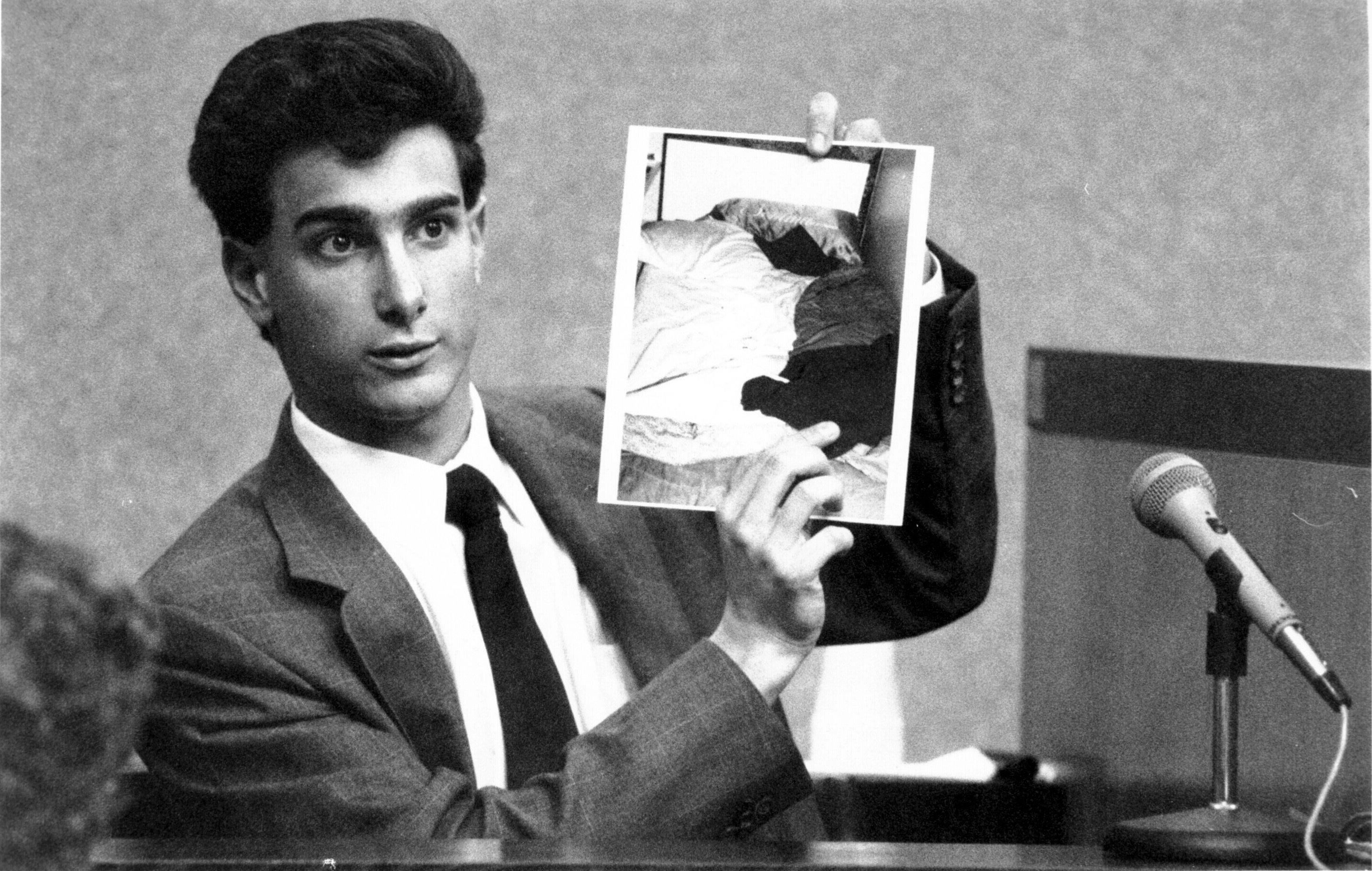 Riverhead, N.Y.: Martin Tankleff holds up a picture of his his bedroom during cross examination on the stand at his murder trial in Riverhead, New York on Sept. 8, 1990. (Photo by John Cornell/Newsday RM via Getty Images) / John Cornell / Newsday LLC