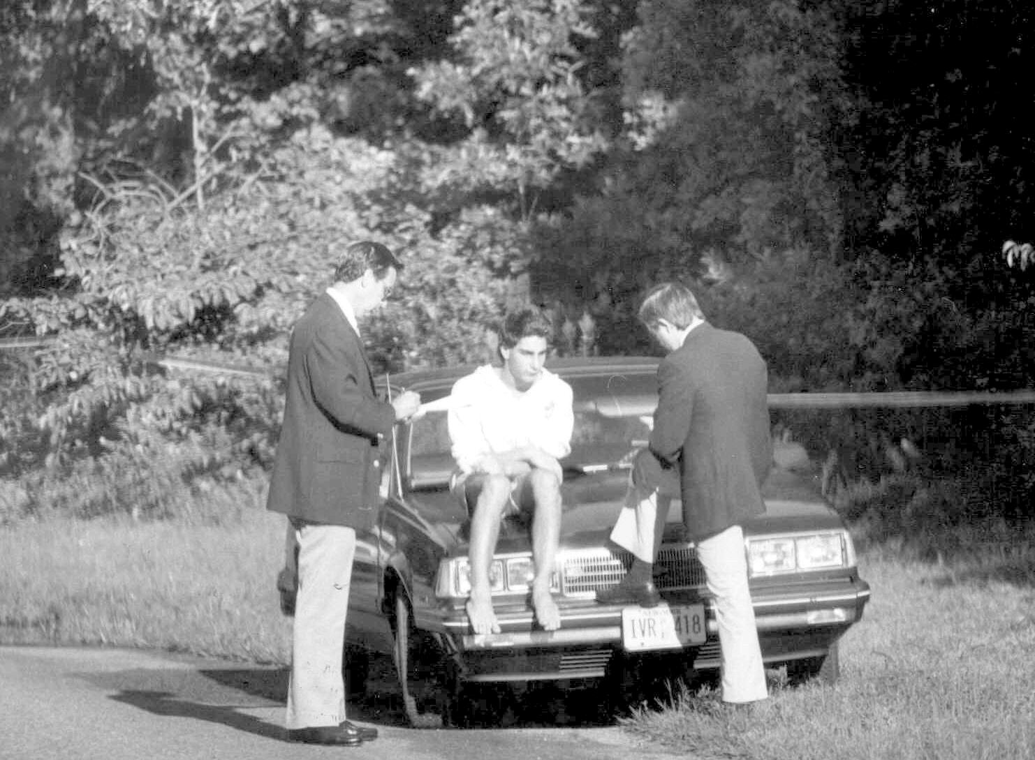 Belle Terre, N.Y.: Suffolk homicide detectives Norman Rein (left) and Robert Doyle interview Martin Tankleff outside the Tankleff's Belle Terre, New York home on September 7,1989, just hours after after his mother was found murdered and his father was found gravely injured there.(Photo by Tony Jerome/Newsday RM via Getty Images) / Newsday LLC
